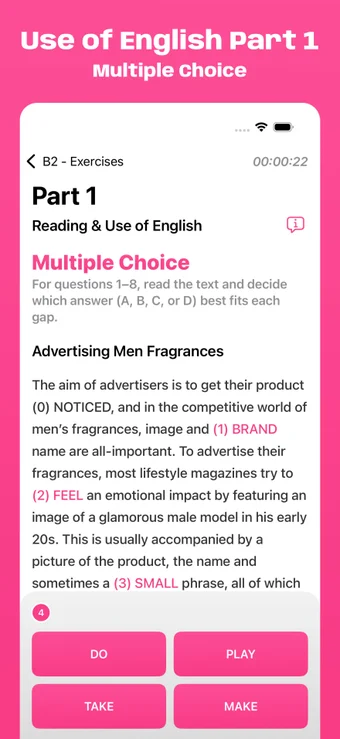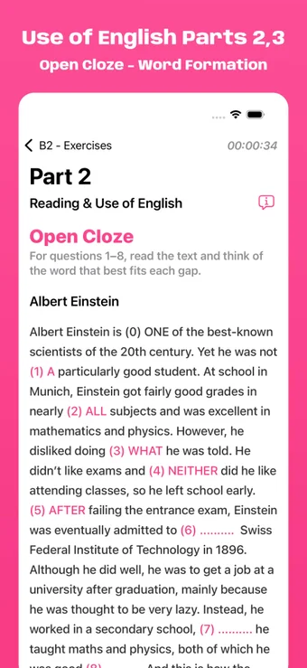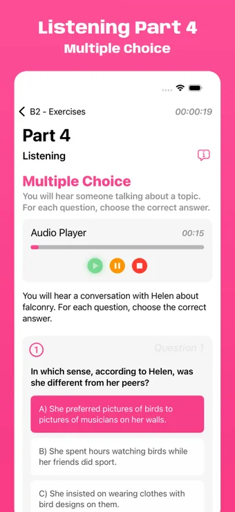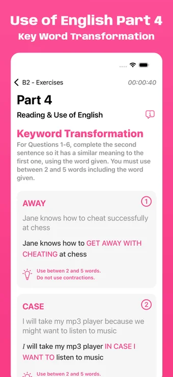 El simulador de examen B2 de Cambridge sirve como un compañero de estudio práctico al ofrecer un entorno realista para desarrollar tu resistencia en las pruebas a nivel B2 específico. Funciona como un simulador de examen completo, que te ayuda a familiarizarte con el formato y el tiempo del examen B2 real. Además, el rastreador de progreso integrado te permite monitorear tus puntuaciones y mantenerte motivado a lo largo de tu viaje de preparación.